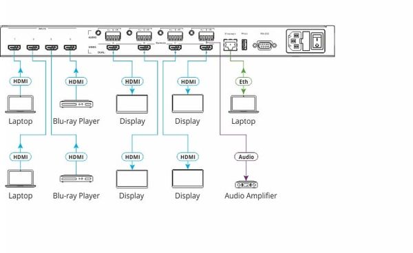 - Audio — 4 balanced and 4 unbalanced audio outputs with independent volume settings per output, embedded audio on the HDMI inputs and outputs.